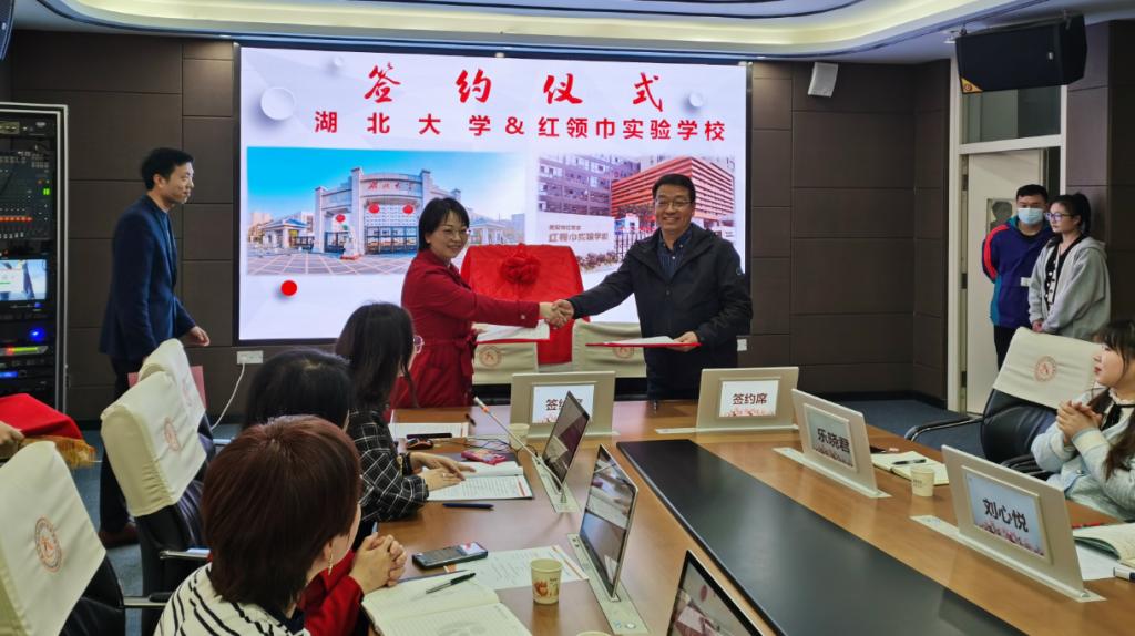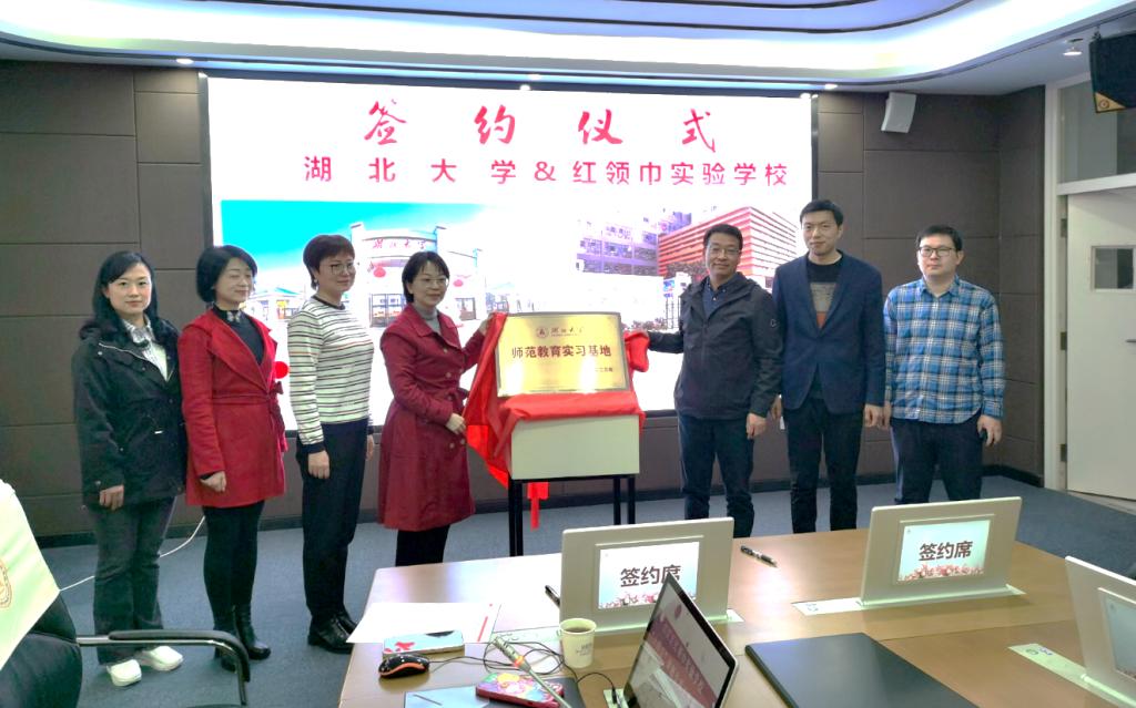3月7日下午,9428cn太阳集团副院长祝逸明、李经天教授、、刘梦君副教授、肖凯博士一行赴江汉区红领巾实验学校,开展9428cn太阳集团古天乐师范教育实地基地签约授牌仪式暨学校“十四五”课题专项工作研讨会。江汉区教育局教科研室主任程慧、红领巾实验学校校长陈赤男及全体管理团队、部分骨干教师参加了签约授牌仪式和座谈会。