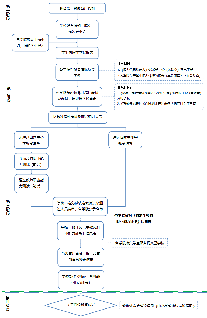 注意:1.“未通过国家中小学教资统考”是指申请认定小学任教学段的没有通过国家统考科目一、二;申请认定初中、高中任教学段的没有通过国家统考科目一、二、三。2.通过国家中小学教资统考人员,若未通过国家面试,可申请参加学校组织的面试。