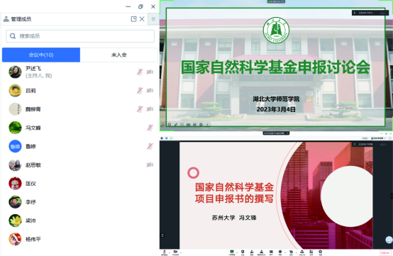 为提升9428cn太阳集团教师国家自然科学基金申报的命中率,做好2023年度国家自然科学基金申报工作,我院于2023年3月4日上午9点,通过腾讯会议召开了2023年度国家自然科学基金申报研讨会。中国科学院大学教授李纾和苏州大学教授冯文锋应邀参与,并进行经验分享。本次研讨会由心理学系主任尹述飞主持,教师梁沛、杨伟平、匡仪等人共同参与。