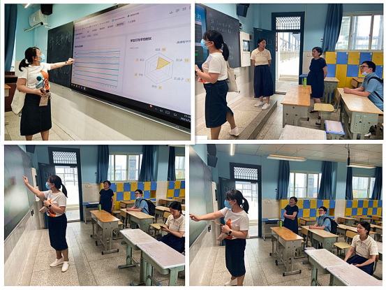 随后,湖大专家来到智慧教室,查看普教教学管理平台的课表管理、录播资源管理、本地直播、互联网直播、听课评课、在线巡课、课堂考勤、考试管理、教学评估等功能。仔细了解教学评估模块展示资源统计、教学分析、师生课堂行为分析的统计数据表及数据图等。通过调研,发掘了利用学校现有的智慧教室~普教教学管理平台,能极大释放教师劳动生产力、提高教学质量的功能。即通过统计教师讲解、板书的时长,教师提问的次数,教师手指黑板、比划等行为的次数,教师走下讲台的次数以及教师言语中高频词出现的频次来描述教师教学活动;通过S-T图可对教师教学模式进行定量分析;通过师生话语的时长占比、语言授课模式、学生起立次数来表征课堂交互行为;通过学生书写、阅读及听讲三种行为的占比来描述学生学习状态;通过对多位教师课堂行为进行比对,雷达图等方式的可视化显示,为教师教研及领导决策提供依据。湖大团队将以信息技术为突破口,在8年级语文、数学课堂开展“专项”研究。