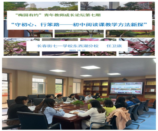 秋风送师情,细研促成长。2023年10月25日下午,第七期“梅园有约”青年教师成长论坛在将军路中学举办。湖大委托管理团队邀请长春街七一学校东西湖分校语文老师任卫旗做“守初心、行笨路——初中阅读课教学方法新探”讲座,湖大李经天教授、华科大教科院张建教授团队一行4人、将军路中学舒敏副书记、教务处陈小丽主任和语文组教师参加了论坛活动。