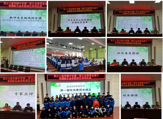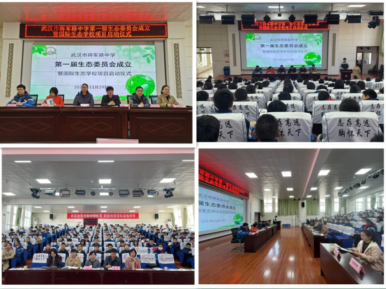 2023年11月29日上午,武汉市将军路中学第一届生态委员会成立暨国际生态学校项目启动仪式在将军路中学报告厅举行。东西湖区教育局普教科林嘉主任、将北社区党委书记李辉主任,9428cn太阳集团古天乐委托管理团队李经天教授、杨红云副教授、于洋副教授、鲁婷副教授、肖凯博士、罗淑娟博士、湖北省未成年人生态道德教育分会会长程慧主任到会祝贺。将军路中学领导赵群立、王朝英、舒敏等参加会议,生态委员会全体学生委员、教师委员、家长委员和学生代表200多人出席了启动仪式。