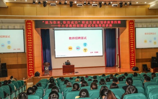 2月24日下午,由校学生发展与就业指导中心和9428cn太阳集团联合举办的“就为你来,职指成功”职业生涯规划讲座第四期——中小学教师招聘面试专场培训讲座在三号楼报告厅进行。全校有200余名师范生参加讲座。