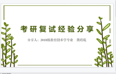 第二期的考研复试经验分享交流会在线上举行。2月24日下午,会上邀请了胡蓝心、孙秋阳、龚靖苑三位优秀毕业生。她们从复试准备、联系导师、简历制作等方面分享了自己的经验,同时还补充了调剂复试、心态调整等情况的应对方案。在提问交流环节,同学们在聊天框积极发言,提出如关于第一学历限制、复习的具体安排等问题,三位学姐都一一作了解答。胡蓝心学姐强调,无论在哪个环节都要认真对待,将实力发挥到极致,复试时一定谦逊有礼,把握住每一次机会。
