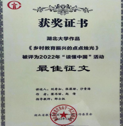 近日,教育部、湖北省教育厅关工委2022年度“读懂中国”系列活动获奖名单陆续揭晓。我院硕士研究生梁伟丽、赵倩两位学生的作品《乡村教育振兴的点点烛光》荣获湖北省教育厅关工委2022年“读懂中国”活动最佳征文奖。