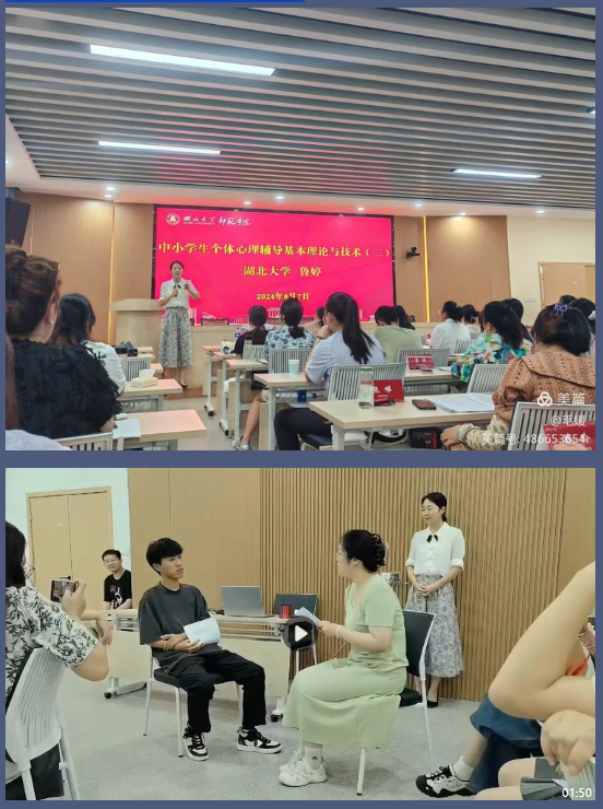 心理学系鲁婷副教授重点介绍了中小学生个体心理辅导的基本理论与技术,模拟展示了个体心理辅导的会谈技术中共情、倾听、指导的正确做法和错误做法,精准生动的现场实操教学案例迅速激起了学员们的兴趣,大家都自发鼓起掌来。