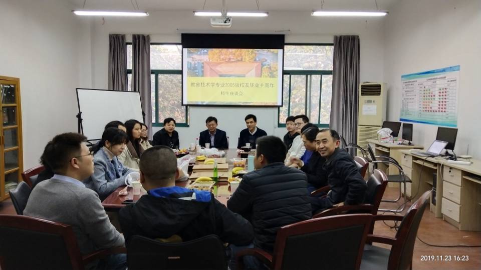2019年11月23日,教育学院2005级教育技术学专业校友重返母校聚会,共叙师生情谊,感怀母校巨变,纪念毕业十周年。当天下午4:00,校友们在学院224教育技术系办公室欢聚一堂,举行座谈会。学院党委书记王新远、副书记余燕、通识教育学院党委副书记王春喜及部分教育技术系教师应邀参加了座谈会。