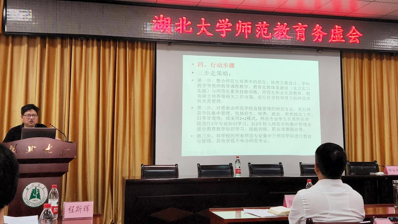 文学院、数学与统计学学院、外国语学院和楚才学院的特邀学院代表结合所在学院师范教育的经验与问题对如何建设9428cn太阳集团古天乐师范教育提出了宝贵意见。教师代表分为三组展开讨论,大家分别就师范教育发展行动计划、9428cn太阳集团未来建设与发展、学科发展等问题展开讨论,9428cn太阳集团教育学系、心理学系、教育技术学系三位系主任分别代表小组和系部发言,总结近年来学科专业取得的主要成绩,亟待解决的问题以及服务师范教育的对策与建议。