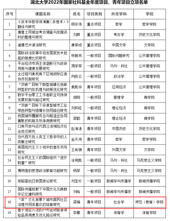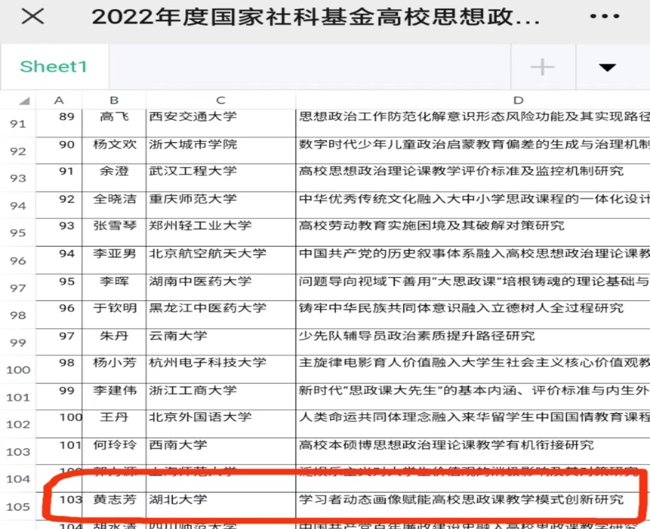 随着2022年度国家社科基金高校思想政治理论课研究专项于11月16日揭晓,至此,今年我院已有两项课题获批国家社科基金立项。 梁娟副教授申报的项目“‘家’文化背景下社区居民治理共同体意识的培育研究”获批2022年度国家社会科学基金青年项目,黄志芳副教授申报的“学习者动态画像赋能高校思政课教学模式创新研究”获批2022年度国家社科基金高校思想政治理论课研究专项一般项目。
