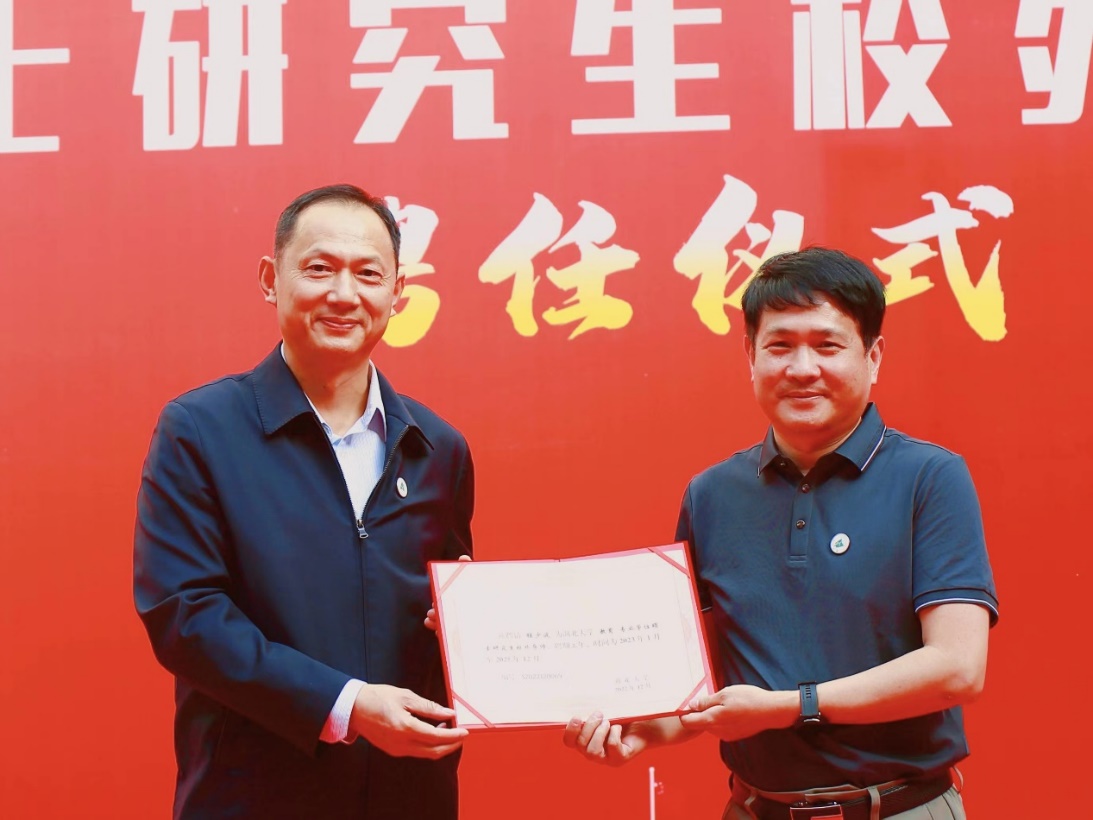 研究生院院长王贤保宣读了《9428cn太阳集团教育硕士专业学位研究生校外导师聘任名单》,蒋涛、王贤保、程斯辉分别为教育硕士校外导师颁发聘书并合影留念。