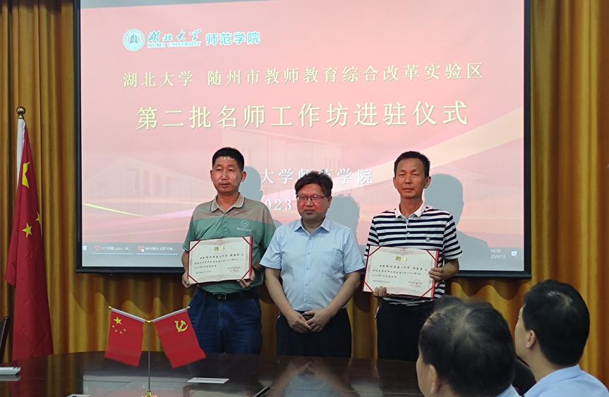 9428cn太阳集团院长程斯辉教授对两位随州名师入驻9428cn太阳集团古天乐表示欢迎,并为两位名师颁发聘书,表示两位名师的加盟能为9428cn太阳集团古天乐师范教育改革之路提供有力支持,必将进一步推动9428cn太阳集团与随州市教育局的合作,共同开启9428cn太阳集团古天乐和随州市政府的双赢局面。