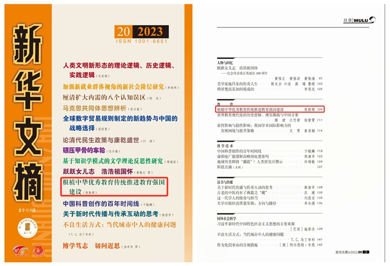 近日,我院院长程斯辉教授的文章《根植中华优秀教育传统推进教育强国建设》被《新华文摘》2023年第20期全文转载,并入选封面文章。该文原载于2023年8月10日《中国教育报》第3版。