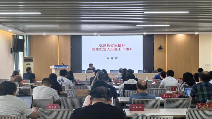 最后,院长程斯辉做《弘扬教育家精神要在坚定人生观上下功夫》报告。他强调,教育不仅传知识,更塑人生观、价值观。教育工作者需有热情,热爱教育事业,创新教学管理,探索新教法。他鼓励全院教师保持赤子之心,点燃学生求知欲,不满足现状,持续提升专业素养和教学水平。