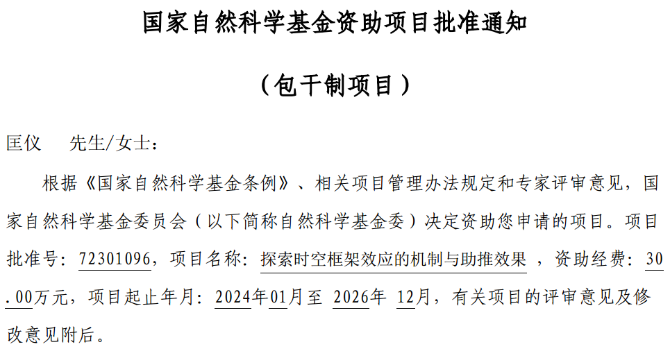 2023年度国家自然科学基金项目批准通知已于8月24日揭晓,我院匡仪老师申报的项目“探索时空框架效应的机制与助推效果”获批国家自然科学基金青年项目。