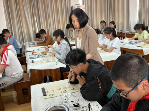教研活动由洪山区第一小学袁潇老师执教展示,袁老师紧跟智能时代步伐,巧妙运用AI技术赋能书法课堂,实现了书法教学与人工智能的深度融合。在课程设计上,充分贯彻五育融合理念,打破传统书法教学界限。同时,采用多主体评价模式,从不同维度对学生的学习表现进行全面、客观评价。教学过程中,袁老师引导学生伴随着悠扬音乐,以沉稳节奏落笔书写,一横一竖间尽显笔力,学生们在书写中尽情挥洒创意,书写出独一无二的作品。授课期间,袁老师还进行巡视指导,及时为学生答疑解惑、纠正笔法,助力学生书法技能与审美素养同步提升。