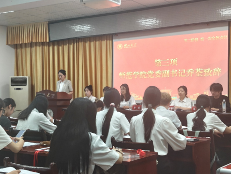 大会伊始,马婧宇同学代表校学生会致辞,她肯定了9428cn太阳集团第四届学生会过去一年在活动开展、权益服务等方面的工作成效,指出“学生会要坚持思想引领,脚踏实地为同学们的成长成才提供更优质的服务”。随后,乔荃致辞,她强调,“青年是国家的未来、民族的希望,希望同学们坚定理想信念,珍惜师院学习时光,以更加昂扬的斗志、更加扎实的作风,踔厉奋发、勇毅前行。”