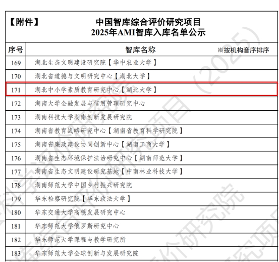 近日,中国社会科学评价研究院公示了“中国智库综合评价研究项目(2025)”AMI智库入库名单,我院湖北省人文社会科学研究重点基地“湖北中小学素质教育研究中心”成功入选。
