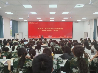 付应雄围绕“当好老师的三个W”主题,向新生们分享为什么选择师范专业、当好老师的意义是什么以及如何做一名好老师,并详细介绍了学院“1+8”高素质师范人才培养规格及师范专业培养方案。