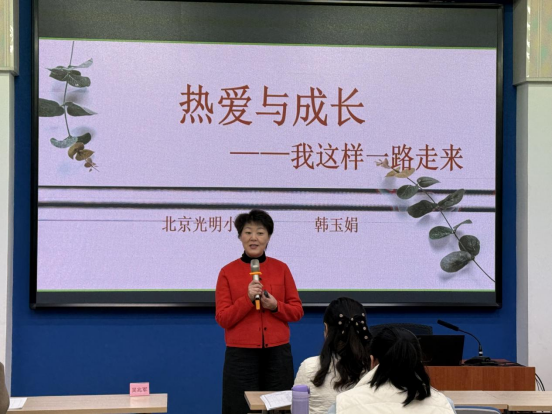 北京光明小学校长韩玉娟以《热爱与成长——我的成长之路》为题,声情并茂地讲述了她数十年来积淀的教育智慧