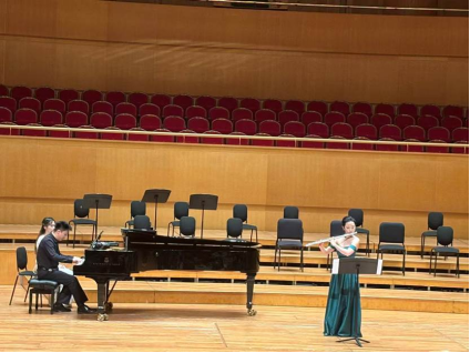 程乾、刘柠蕊联袂登台,以钢琴与长笛的典雅对话,深情演绎《灯火里的中国》。旋律温暖真挚,情感充沛内敛,似溪流勾勒山河壮丽,如星光映照万家安宁,生动绘就一幅国泰民安的时代画卷,也传递出我校归国留学人员对祖国的深切眷恋与美好祝福。