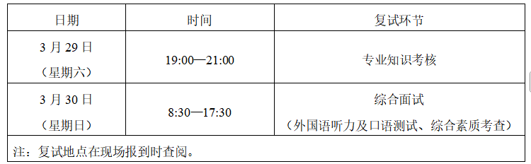 学院复试包括专业知识考核、外国语听力及口语测试、综合素质考查三项,时间安排如下: