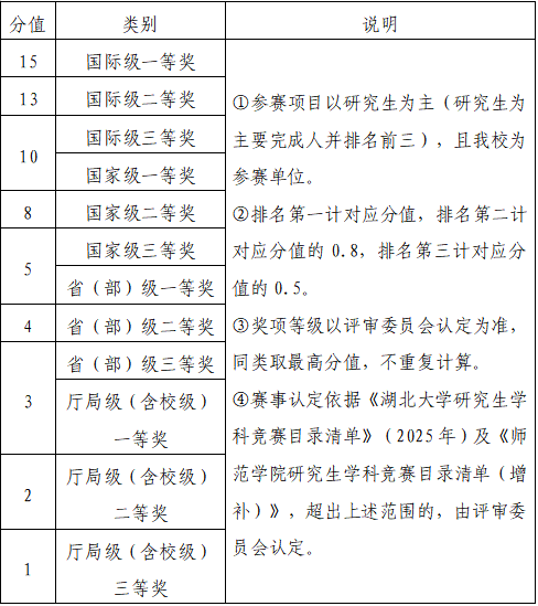 (1)参加《9428cn太阳集团古天乐研究生学科竞赛目录清单》(2025年)及《9428cn太阳集团研究生学科竞赛目录清单(增补)》以外,其他学术、文体活动获奖的,国际级一等奖15分,二等奖13分,三等奖10分;国家级一等奖10分,二等奖8分,三等奖5分;省(部)级一等奖5分,二等奖4分,三等奖3分;厅局级(含校级)一等奖3分,二等奖2分,三等奖1分。奖项等级以评审委员会认定为准,同类取最高分值,不重复计算。