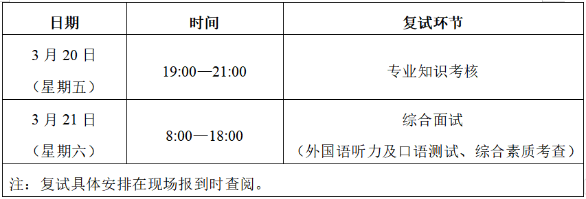 学院复试包括专业知识考核、外国语听力及口语测试、综合素质考查三项,时间安排如下: