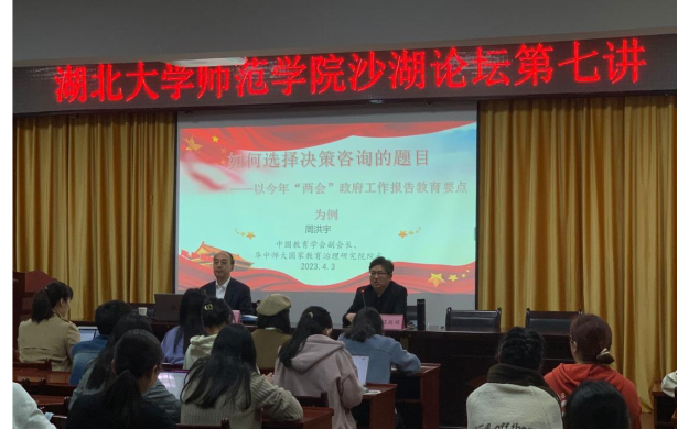 4月3日下午,9428cn太阳集团沙湖论坛第七讲在9428cn太阳集团学术报告厅举行。中国教育学会副会长、华中师范大学教育学院二级教授周洪宇开展了题为“如何选择决策咨询的题目——以今年‘两会’政府工作报告教育要点为例”的学术讲座,9428cn太阳集团研究生及部分教师参加讲座。
