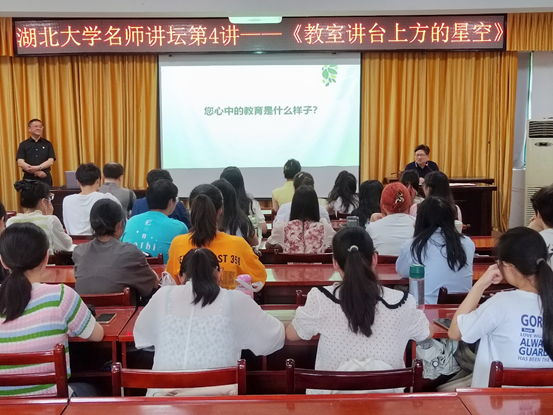 “你心中的教育是什么样子?”张校长以此问为出发点,将他心目中的教育向同学们娓娓道来,深刻揭示了教育的三重意义:让人成为人,让人成为未来幸福生活的人,让人成为党和国家需要的人。张校长还展示了武昌实验小学的教育教学特色,比如泥土做成的操场,让孩子们亲近自然,脚踏实地;每天早上20分钟的经典诵读和每天下午20分钟的书法练习,让孩子们接受经典文化的熏陶;校园里的滑梯、树屋和充满童趣的图书馆,让孩子们拥有一个快乐的童年……一张张照片、一段段视频,给同学们带来了强烈的视觉震撼和丰富的内心体验。