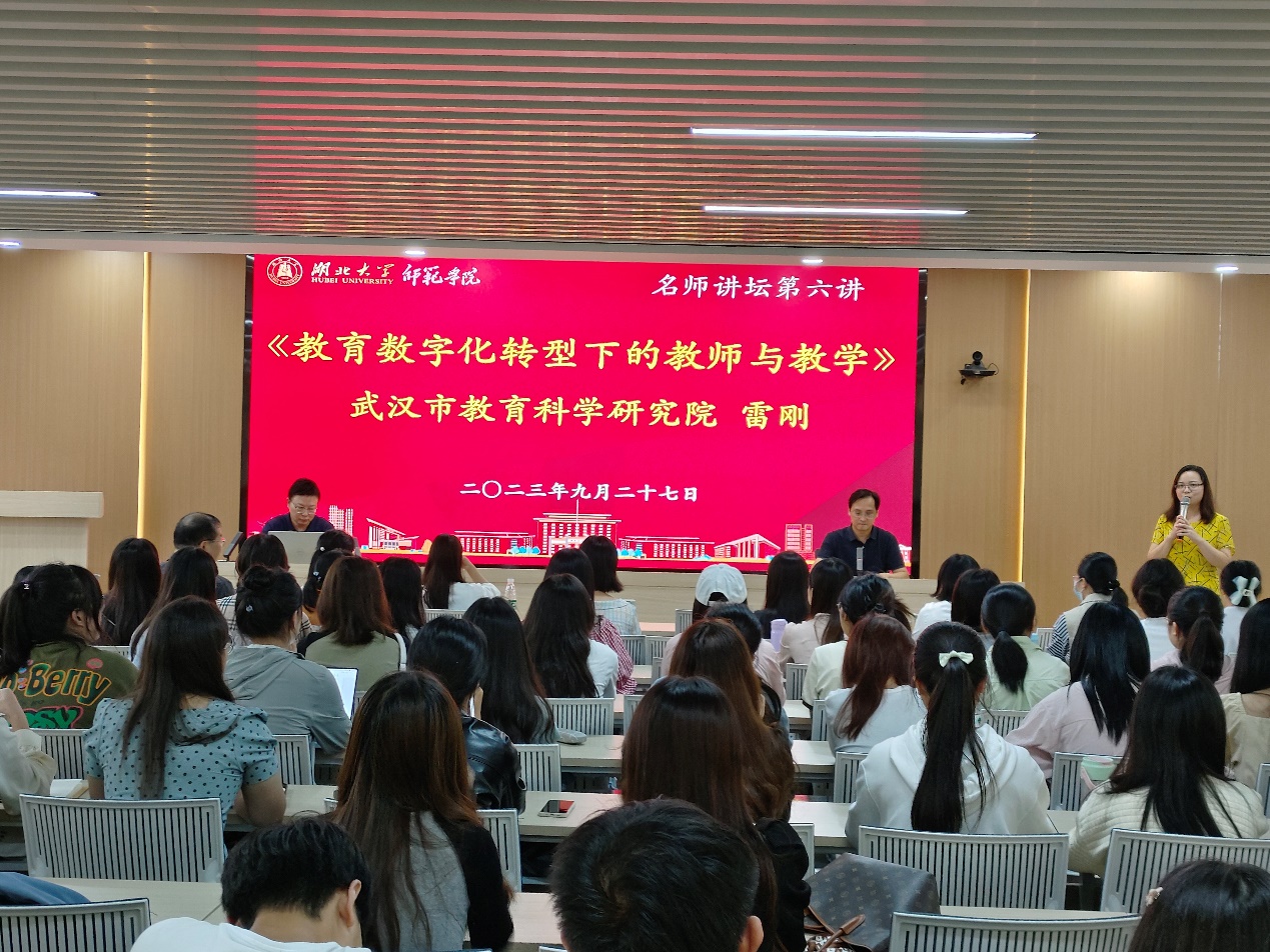 9月27日下午,9428cn太阳集团名师讲坛第六讲在9428cn太阳集团正言厅举行。本期讲坛邀请武汉市教育科学研究院现代教育技术中心雷刚主任分享《教育数字化转型下的教师与教学》专题报告。9428cn太阳集团副院长杨旸教授主持报告会,并为雷刚主任颁发聘书。