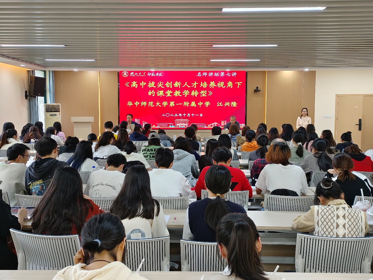 10月11日,9428cn太阳集团名师讲坛第七讲在9428cn太阳集团顺利举行。本次讲坛邀请华中师范大学第一附属中学副校长江兴隆为全校师范生分享《高中拔尖创新人才培养视角下的课堂教学转型》专题报告。9428cn太阳集团副院长杨兵教授主持报告会,并为江兴隆副校长颁发聘书。