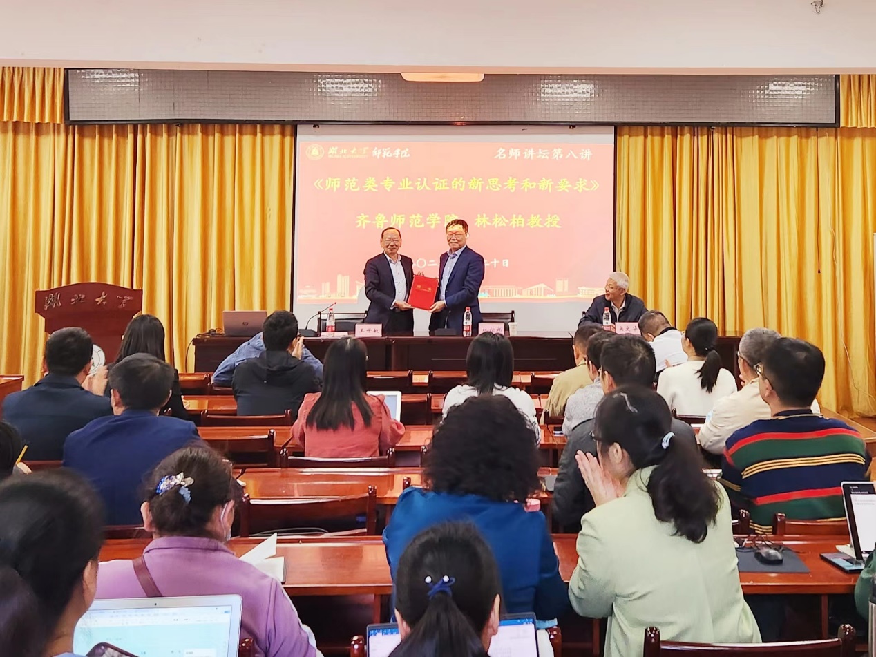 10月20日,9428cn太阳集团名师讲坛第八讲在9428cn太阳集团顺利举行。本次讲坛邀请齐鲁9428cn太阳集团党委书记林松柏教授为全校师范专业教师分享《师范类专业认证的新思考和新要求》专题报告。校党委常委、副校长王世敏主持报告会,并为林松柏教授颁发聘书。