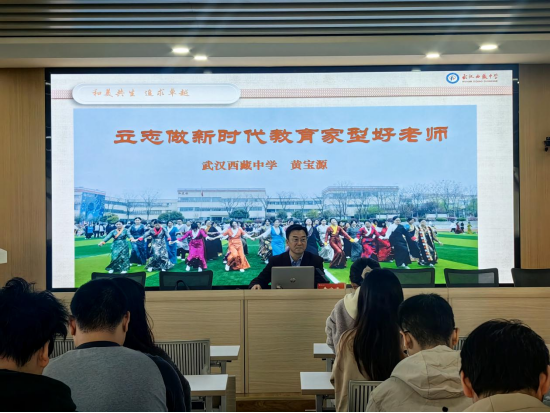 黄宝源校长从自身教育经历讲起,分享武汉西藏中学老师们积极践行教育家精神的教育故事,“一个手术改变一名学生的命运”“深耕课堂提升教书育人能力”等,让在场师生深切感受到教育家精神的内涵与力量。